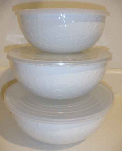 Set of 3 enamelware white on white swirl mixing bowls with stainless steel rims and plastic lids from Golden Rabbit. Bowls measure 10.5", 9.75", & 9" in diameter. All white interior. The bowls capacity is 3 quarts, 3.5 quarts and 4.5 quarts.