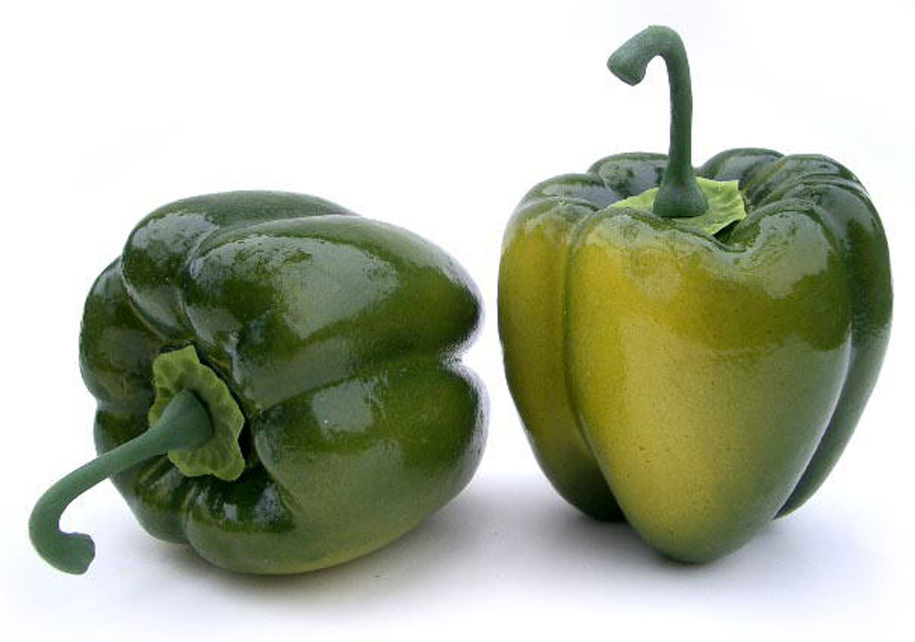 Box of 6 artificial Bell Peppers, green. They measure about 3.5". Plastic stem and color variations on body of vegetable. Life-sized. Made from extruded polyfoam. Made in China. Not edible. For decoration only.