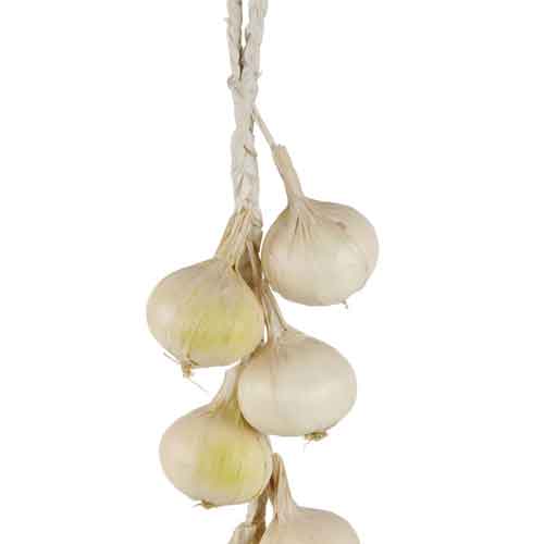 One braided strand of 7 artificial white onions. Measures 23" long. Perfect for vegetable arrangements or kitchen displays! For decorative use only.