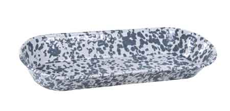 One Golden Rabbit Enamelware Grey Swirl Oval Bread Basket . This oval bowl has rolled edges like traditional enamelware. It measures 16" long, 6" wide and stands 1.75" high. Golden Rabbit enamelware rolled edge products are handcrafted in China where porcelain enamels are fused onto carbon steel at very high temperatures. The two coat process results in a slightly textured surface. In terms of durability, Golden Rabbit enamelware holds up to oven, stove-top and even broiler heat, as well as freezer storage. It is dishwasher safe, but is not intended for microwave use.