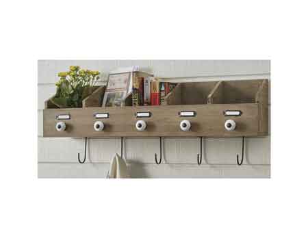 Park Designs Rustic Wood Wall File Box. Features white knob accents with label slots for each box and 5 metal hooks for hanging towels, jackets, scarves, dog leashes, etc! Measures 7.5"H X 30"W X 7" deep. Rustic style accent for any room!