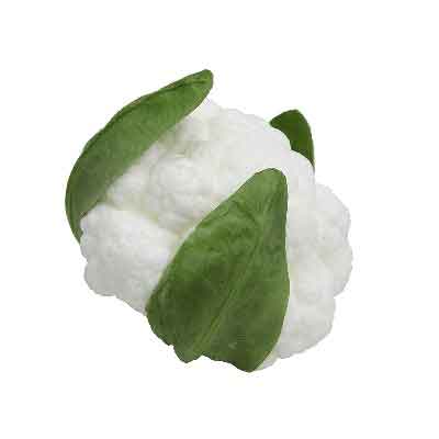 Soft Foam Cauliflower Head with Leaves, approximately 12+ florets of varying heights. Variations in the white color help make this vegetable more realistic. Measures about 4" X 5.5".