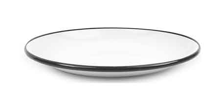 Set of 4 Crow Canyon Home 8" diameter black rim enamelware small coupe plates. Perfect for sandwiches, desserts, and snacks. Made from high quality carbon steel coated with white porcelain enamel and finished with a black rim. The plates have a rounded shape with a curled edge. Dishwasher safe. Do not use abrasive cleansers or hard water spot removers on this surface. Enamelware is not intended for microwave use.
