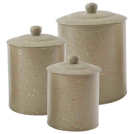 One set of 3 Park Designs Sandstone Graniteware canisters with lids. The canisters are made to look worn and rusted in some spots, distressed areas are a part of the design. The canisters measure 7.625H X 5.75 Diameter; 8.625H X 6.5 Diameter; 9.625H X 7.25 Diameter. Made from steel coated with porcelain enamel in the traditional graniteware style. Some Assembly is required: The knobs will need to be attached to the lids. All hardware is included. See the whole collection of dinnerware and accessories, available separately