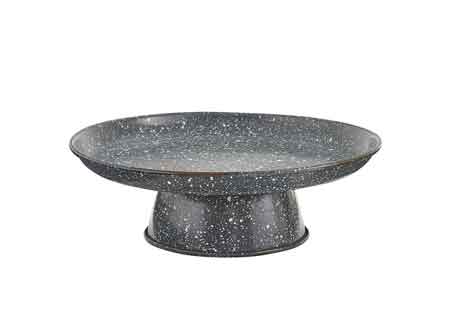 Park Designs Graniteware Cake Pedestal. Traditional graniteware with a solid gray base and speckled white. The Cake Pedestal has an 12" diameter with a curved edge and stands 3.75" high. Dishwasher safe, but not for use in the microwave or oven. Perfect for highlighting your favorite cake!