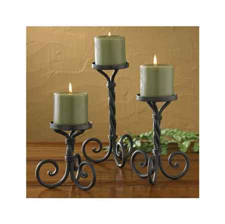Park Designs set of 3 iron pillar candle holders. Scrolled iron curled and twisted into beautiful pillar holders. 3.5 inch diameter base is perfect for 3" pillars. 5 inch, 7 inch, and 10 inch sizes.
