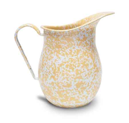 2 quart Crow Canyon Home Enamelware Yellow Marble Pitcher is 9" tall x 9.5"W. Hold 2 Quarts. Great showpiece or vase, too. Made from steel coated with porcelain enamel. Not recommended for microwave use. Dishwasher safe. Made from carbon steel coated with porcelain enamel in a two coat process that results in a slightly textured surface. Color patterns and coverage varies making each pitcher unique.