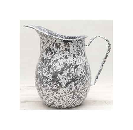 2 quart Crow Canyon Home Enamelware (Light) Grey Marble Pitcher is 9" tall x 9.5"W. Hold 2 Quarts. Great showpiece or vase, too. Made from steel coated with porcelain enamel. Not recommended for microwave use. Dishwasher safe. Made from carbon steel coated with porcelain enamel in a two coat process that results in a slightly textured surface. Color patterns and coverage varies making each pitcher unique.