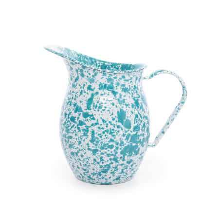 q2 quart Crow Canyon Home Enamelware Turquoise Marble Pitcher is 9" tall x 9.5"W. Hold 2 Quarts. Great showpiece or vase, too. Made from steel coated with porcelain enamel. Not recommended for microwave use. Dishwasher safe. Made from carbon steel coated with porcelain enamel in a two coat process that results in a slightly textured surface. Color patterns and coverage varies making each pitcher unique.