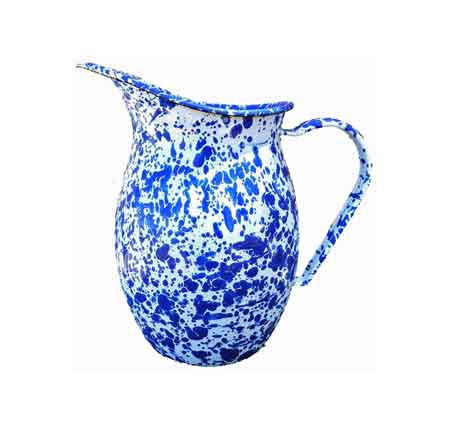 2 quart Crow Canyon Home Enamelware Blue Marble Pitcher is 9" tall x 9.5"W. Hold 2 Quarts. Great showpiece or vase, too. Made from steel coated with porcelain enamel. Not recommended for microwave use. Dishwasher safe. Made from carbon steel coated with porcelain enamel in a two coat process that results in a slightly textured surface. Color patterns and coverage varies making each pitcher unique.