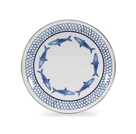 Set of 4 Golden Rabbit Enamelware Fish Camp Dinner Plates. Plates measure 10" in diameter. New flat plate design with rounded sides. Stainless steel rim provides extra durability and a sophisticated look. Part of Golden Rabbits Fish Camp Collection.This enamelware is made of carbon steel coated with porcelain enamel and trimmed with a stainless steel rim. Oven and broiler safe to 500 degrees. Dishwasher safe, but dry promptly. Do not wash with hard water softeners or lemon based detergents- this will affect the finish. Do not soak. Enamelware is naturally non-stick and washes up with little effort. Do not use abrasives or scratch pads.The graphic designs on Golden Rabbit enamelware are fused into the enamel during the firing process and are covered with glass fritz that gives the piece a protective surface as well as a high gloss finish.Enamelware should not be used in the microwave. Made in Indonesia.