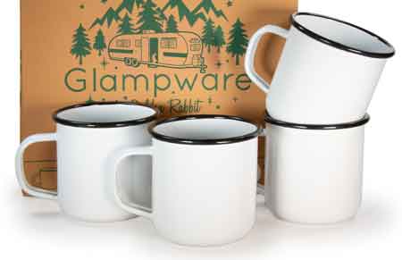 One boxed set of 4 Golden Rabbit Enamelware Glampware rolled edge mugs. The mugs are 3.5 inches tall and have a 12 ounce capacity. Unlike traditional camping tinware, Golden Rabbit's new rolled edge Glampware is developed using their signature thick gauge steel and high quality porcelain enamel, making the Glampware durable, scratch resistant and naturally non-stick with a remarkably long lasting finish. Glampware bowls and plate sets are sold separately. Dishwasher safe, not intended for microwave use.