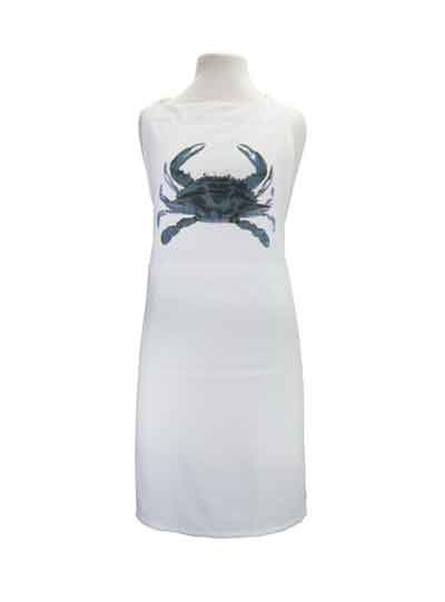 Golden Rabbit Blue Crab Kitchen Apron. 100% cotton. Made in India. One size. Large front pocket. Adjustable neck strap. Approx. 33" in length. Machine washable, tumble dry low. Part of Golden Rabbits Blue Crab Collection of enamelware and kitchen linens.